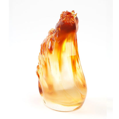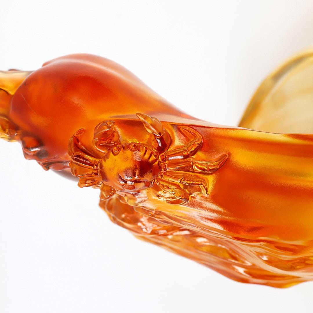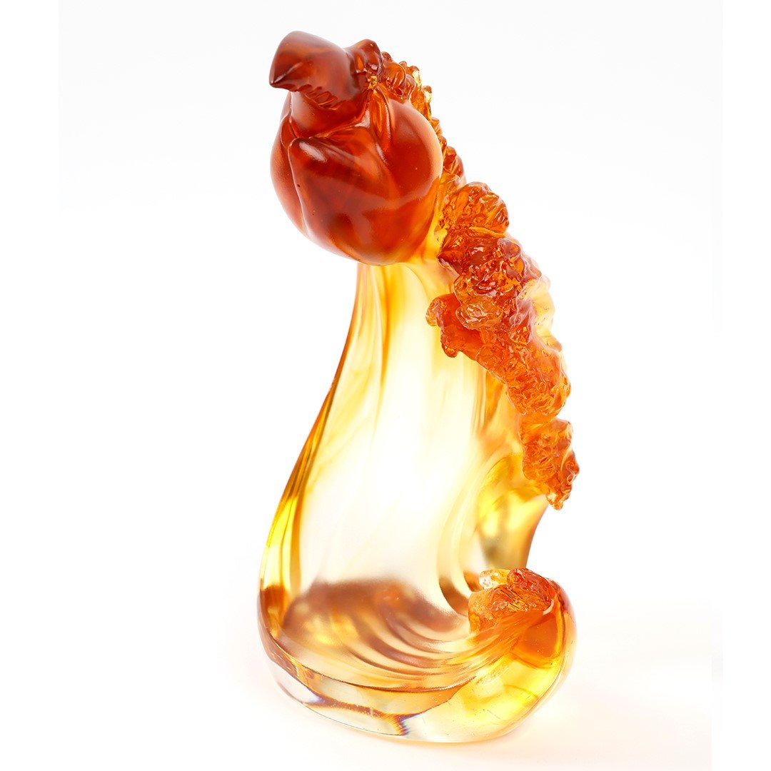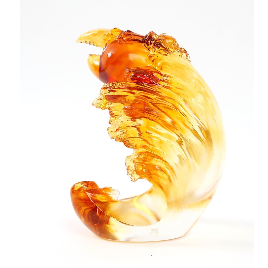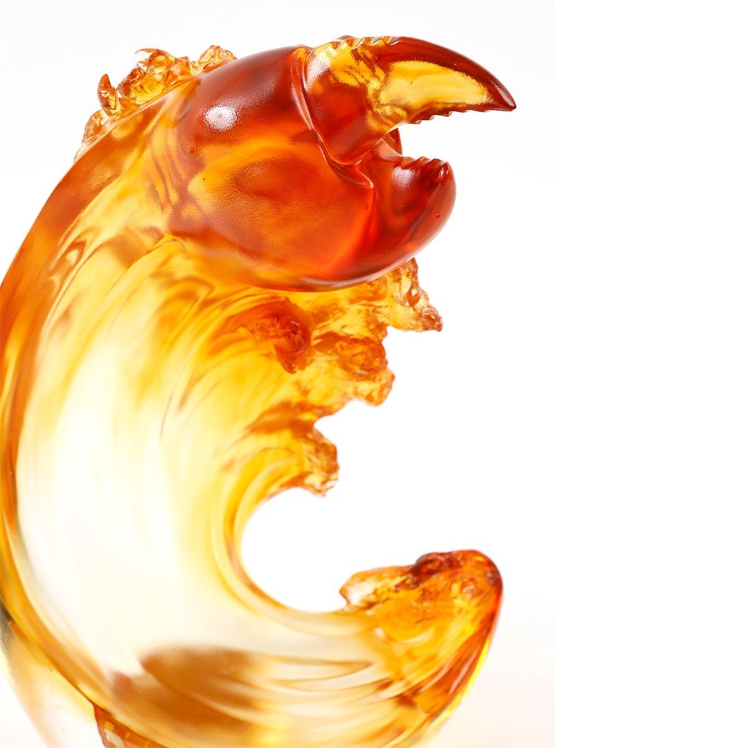 Design Concept: The semi-abstract Chinese sculpture shown here is a standalone concept piece designed by LIULI artists for the “Prosperity Ubiquitous” collection. With a crustacean claw rising from a symphony of ocean waves, the piece regards the relationship between prosperity and ambition with an intimate understanding. That is because without a firm heart and strong will one cannot hope to achieve richness and fulfillment in life. Also, the artwork here does not neglect the subtleties that LIULI is known for—light color shading contrasting the waves’ white water… a humble crab perched on the central subject…. “Incomparable” is the more assertive statement in “Prosperity Ubiquitous,” and pays homage to the ambition in all of us. |