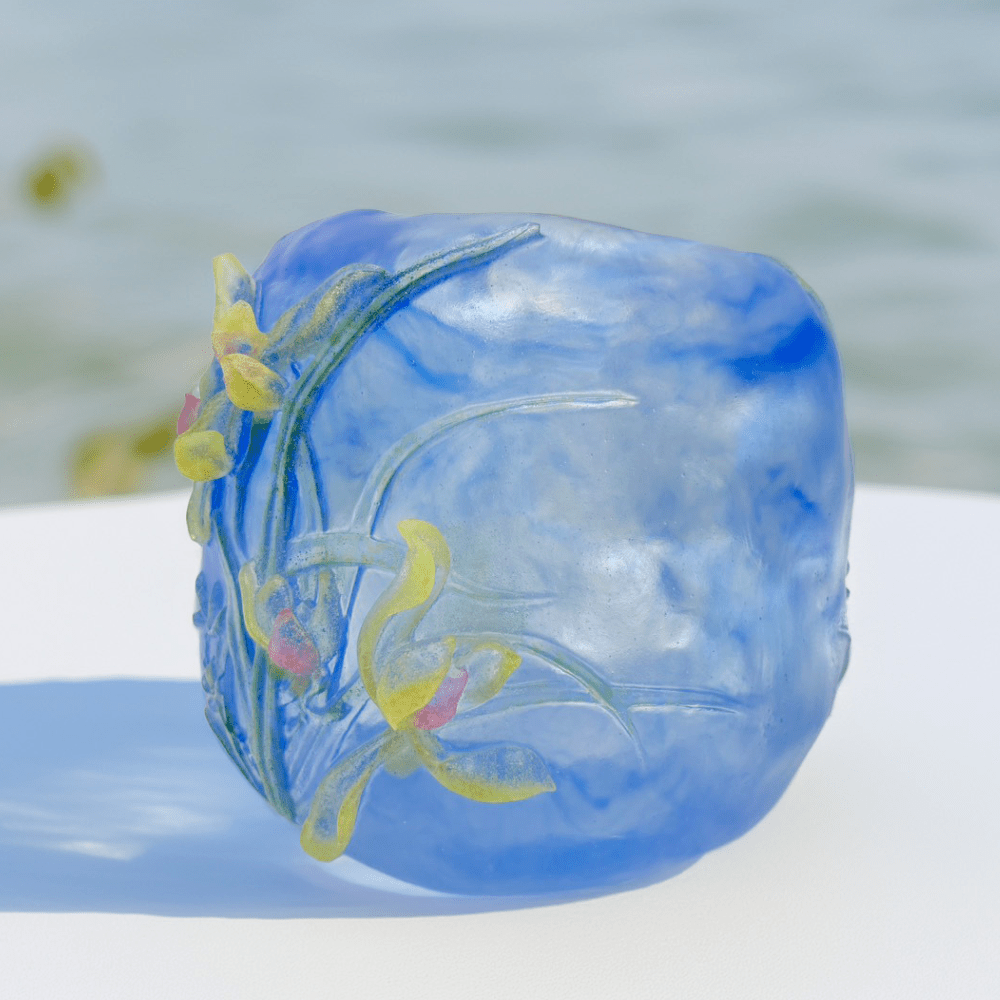 Design Concept: This orchid-inspired work of pate-de-verre glass follows a more understated style of beauty in art. LIULI studio artists purposely render the piece vague and ambiguous to invoke the imagination. Instead of more vivid colors, this glass art piece mimics the quiet confidence of the depicted orchid and opts for translucence instead. "Limpid showers" invokes a feeling of ethereal beauty that can only be found in serenity and quiet contemplation. |