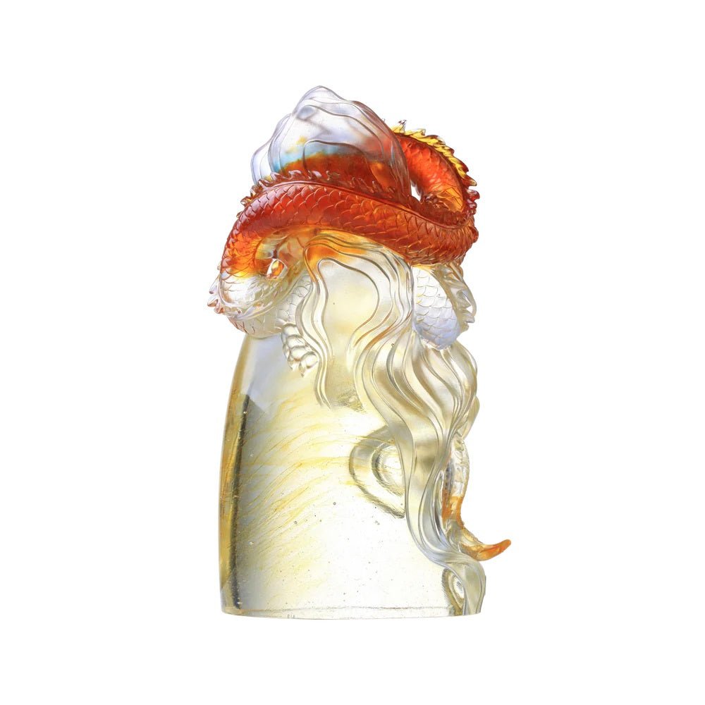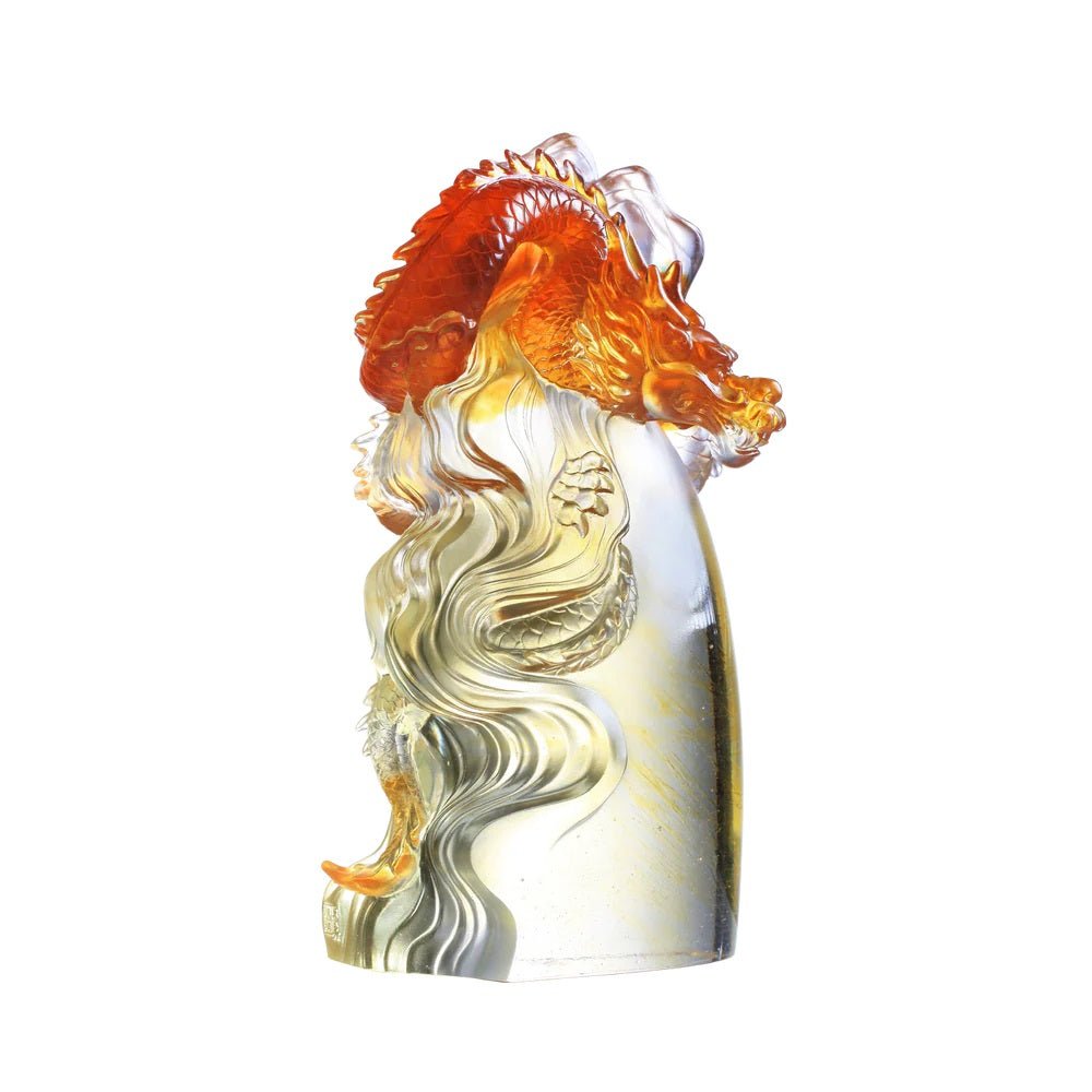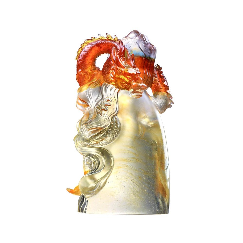 This work is crafted using granulated materials, showcasing the majestic dragon emerging from the water and perching atop a high mountain, surrounded by the mysterious veils of clouds. The sculpture ingeniously integrates water, mountains, and clouds into a cohesive composition, with the sturdy base resembling a towering mountain reaching into the clouds. The transparent base reveals layers of ethereal patterns, creating a sense of rising mist. The condensed lines on the left symbolize the scene of the dragon emerging from the sea. With its gaze fixed and mouth slightly open, the dragon's song resonates through the nine heavens, portraying an unstoppable demeanor. In traditional culture, dragons are revered as divine beings capable of controlling clouds and rain, symbolizing smooth and prosperous endeavors. The artwork, crafted using transparent and monochromatic (amber/purple) glass materials, achieves precise coloring through the meticulous blending of granulated and block-like glass, depicting the elusive nature of the dragon as it appears and disappears in the clouds, water, or atop mountains, perfectly capturing the effect of a mystical dragon.