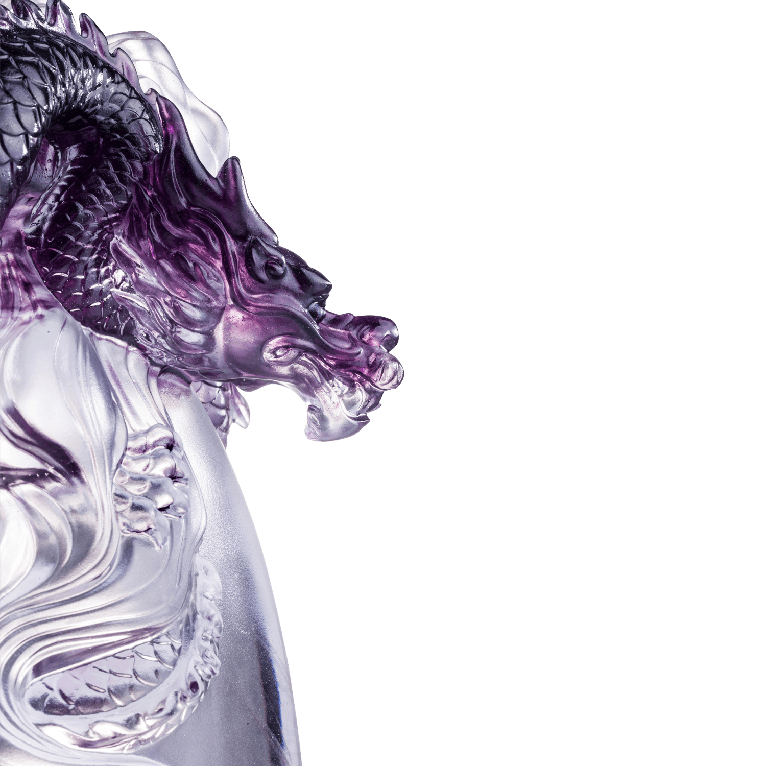 龍吟九霄是運用顆粒料燒製的作品,通過龍身不同部位的定色,表現神龍從水中升起,盤踞於高山之巔,在雲層中若隱若現的神秘感。雕塑上,巧妙構圖將水、山、雲三種元素融為一體,穩固的底座彷彿高聳如雲的山峰,透明底座中一層層縹緲的琉紋,又營造出雲霧升騰質感。左側凝練的線條,象徵蛟龍出海的場景。龍瞠目,似俯瞰天下,嘴微張,龍吟響徹九霄,展現一種勢不可擋的氣度。在傳統文化中,龍是興雲雨的神靈,具有象徵風調雨順,助事業順風順水之意。作品以透明和單色(琥珀色/紫色)琉璃料定色而成,通過顆粒與塊狀琉璃料精準地配比,將龍掩映於雲、水中,或現身於山巔,完美刻畫了神龍見首不見尾的效果。