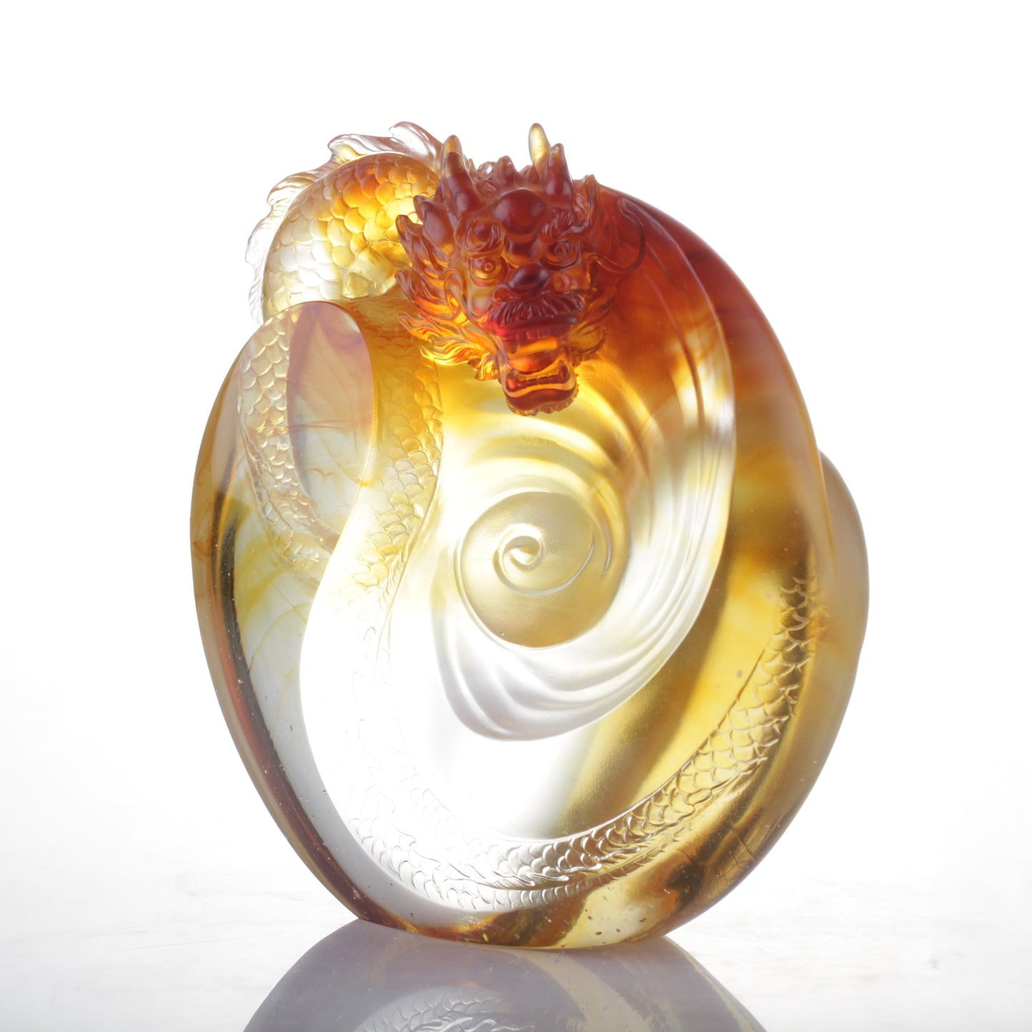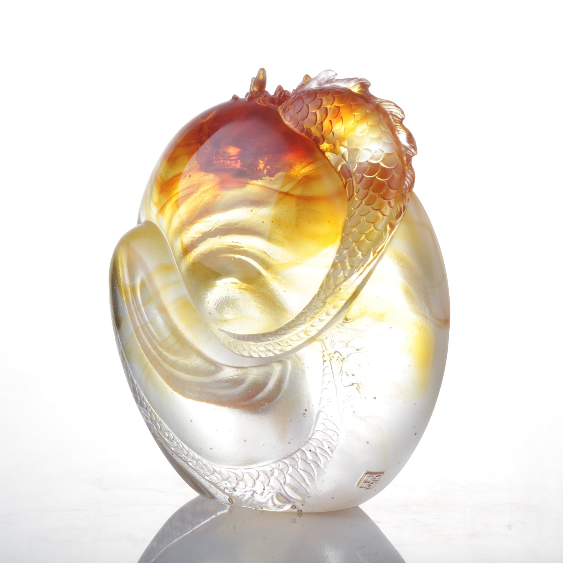 Design Concept: This design depicts the dragon in natural repose as it winds around to form a taichi and conveys its power. The dragon’s head emerges with a persistent gaze as it safeguards the natural order in a way only it can command. Liuli absorbs and reflects light across varying sculptural depths and polished surfaces to convey the dragon’s internal power. The design as a whole is built upon Daoist philosophy: From taichi, two complementary forces are born; from two complementary forces, four aggregates are born; from four aggregates, eight trigrams are born. This is also symbolic of the dragon - a mythical beast that unites all with the power of the sun under the natural order. In the vast universe, the sun is the source of all life. With the dragon, it nurtures and guides the world in harmonious coexistence. 設計概念說明: 龍能感知萬物的運行,龍身順應自然之氣,依勢盤為太極。神尾不輕易顯露,神秘莫測。龍身雕刻細膩,盤旋之下,更讓觀者感受到蒼龍遒勁的力量。龍首矯出於太極之上,目光堅毅,展現守護自然平衡的神獸權威。琉璃特有的光,通過浮雕和精細拋光面的設計下,神龍的內在力量呼之欲出,體現出現代雕塑的動人一面。作品整體設計,以太極:「太極生兩儀,兩儀生四象,四象生八卦」的道家哲學與象徵東方太陽力量的神獸蒼龍展現天地間的和諧統一,道法自然。浩瀚宇宙中,太陽是地球所有生命的能量來源,大自然遵循規律繁衍生息,二者缺一不可。一切造化,仿佛冥冥中,存在巨大且深遠的力量主導著世間的運行。 |