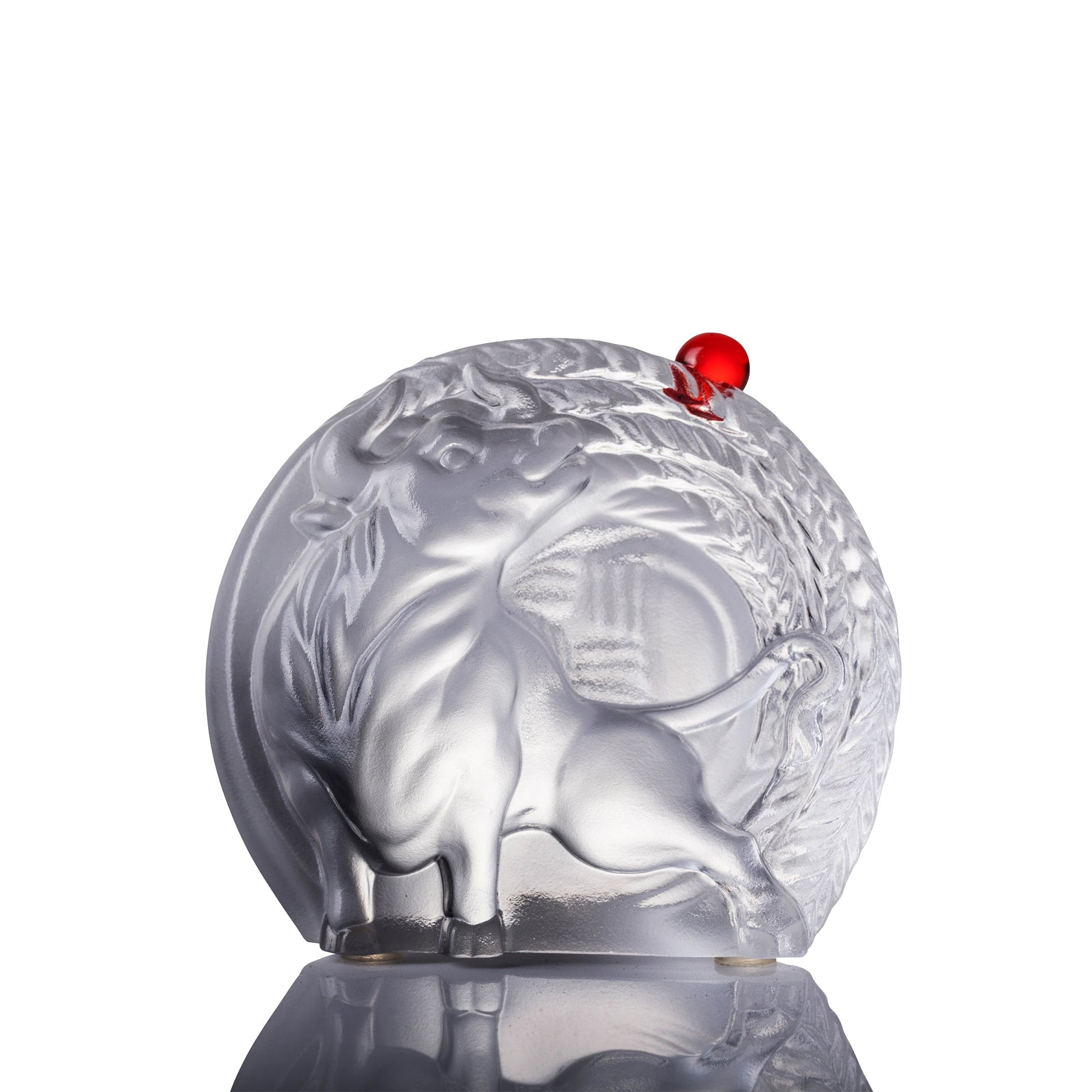 Design Concept: This is the exclusive design for East West Bank in the Year of the Ox. The Great Harvest encapsulates the beauty and brawn of the ox in an ornamental liuli Design. This sculpture juxtaposes the sinewy form of the ox against lush wheat in a display of aesthetic harmony. With its head raised toward success, the beast’s sturdy hooves grip the earth, ready to advance with courage. The Great Harvest symbolizes a tenacious and unyielding spirit and unstoppable ambition. Behind the ox, heavy stalks of wheat symbolize an overflowing harvest, the fruits of its labor. The red liuli pearl is like the sun, connecting to the ox’s line of vision, a symbol of success and hope. The wheat bends to the arc of the sculpture, adding dimension and creating a visually arresting design. The ox’s raised head and sinewy form are juxtaposed against a background of lush wheat. Dimensional and dynamic, the ox locks its gaze upon the red liuli pearl. 這是一款展現公牛力與美的琉璃擺件。雕塑賦予公牛健美有力的肌肉線條,與麥穗相呼應的構圖,充滿美學上的和諧。公牛上揚回望的姿勢,是勝利的眺望。矯健四肢,能感受到動感,仿佛下一秒蹬地而發,勇敢前行, 代表堅韌不拔的精神與永不停歇的進取心。沉甸甸的麥穗,代表著豐收,是辛勤勞動後的成果。紅色琉璃珠寓意太陽,與牛的視線相交,是勝利與希望的象征。麥穗的弧形線條,勾勒出作品圓滿的輪廓,增強了視覺感染力,賦予作品更加立體的觀賞體驗。 牛的造型昂揚向上, 肌肉線條流暢有力, 麥穗與弧線的銜接營造一種空間感. 造型富有動感牛的視線與琉璃珠形成互動. |