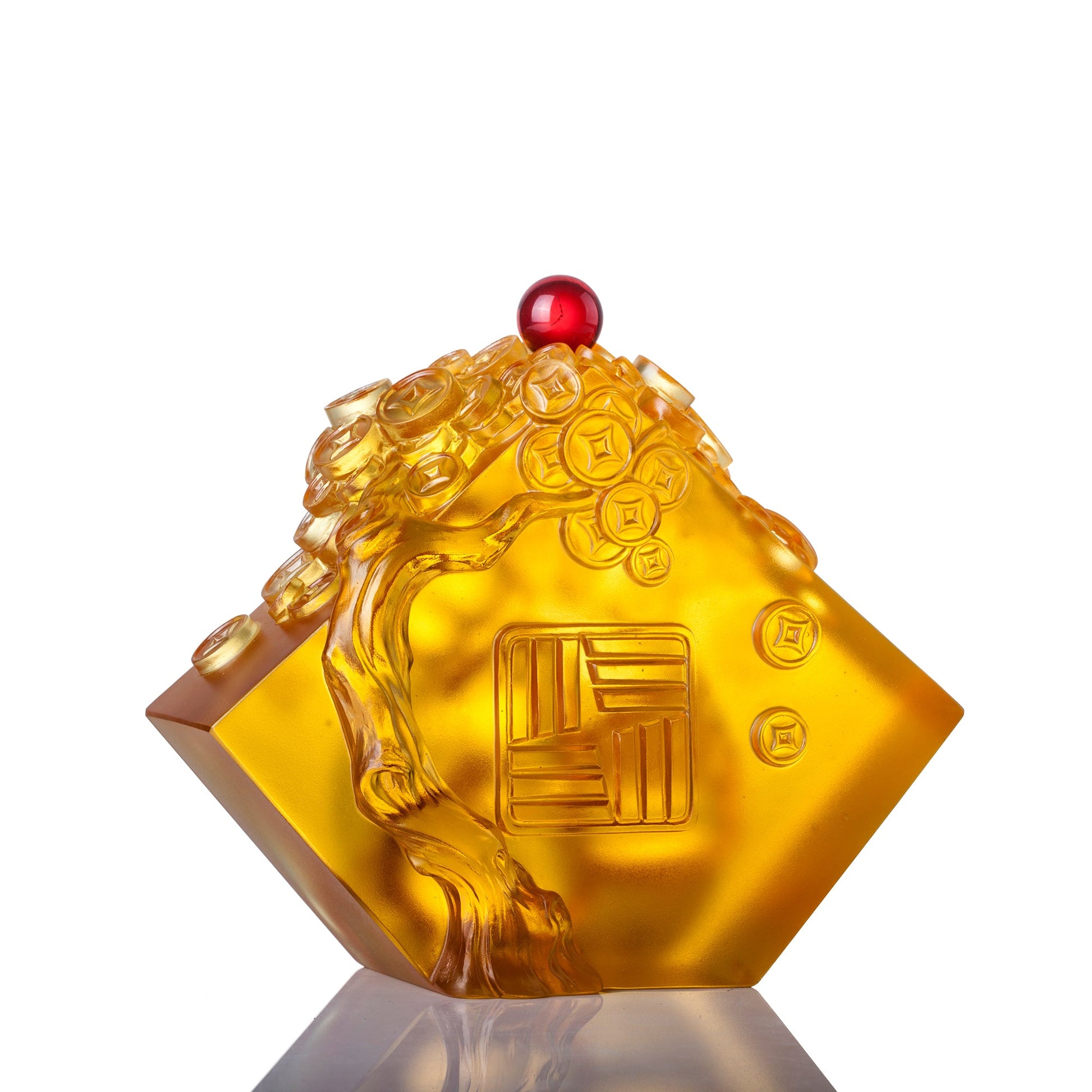 Design Concept: This is the exclusive design for East West Bank in the Year of the Rat. This design is inspired by the sayings “the rat carries fortune” and “with a rat comes fortune”. The sculpture tells a narrative of two diligent rats working together to gather their wealth. The source of this wealth is a lush money tree. Growing with vigor and profusion, the tree is laden with coins. With a limitless supply, one rat is responsible for carrying the fortune, the other for gathering it. The signature red liuli bead is used in all zodiac series’ and is embedded in an eye-catching location. The design’s outline resembles a classic fan shape, symmetrical and sturdy. Two little rats work together – one carrying the fortune, the other gathering it. Theirs is a prosperous bounty yielding fortune and wealth. A money tree grows up the back of the piece, its branches reaching far and wide. East West Bank’s logo centers the design. May your wellspring of fortune never abate. 華美銀行,雙贏優質的服務,保障財富穩健,升值。設計靈感來自「老鼠運財」及「鼠來寶」。細膩雕塑令作品有了故事性:兩隻可愛小鼠齊心協力,獲取源源不斷的財富;財富的來源,是一棵象征生機的搖錢寶樹,寶樹枝幹蒼勁有力,樹頂結滿了錢幣型的碩果,寓意取之不盡用之不竭的財富,兩隻老鼠,一隻負責「運財」 ,一隻負責「聚財」。紅色琉璃珠,成為生肖系列的象征物,在作品最矚目處鑲嵌。作品外廓為典雅的扇形對稱且穩健兩隻可愛小鼠親密合作,一隻運財,一隻聚財收穫頗豐,財富滾滾來作品背面為一棵搖錢寶樹沿著搖錢樹的枝幹舒展華美銀行的LOGO置於中心源源財富從此而來. |