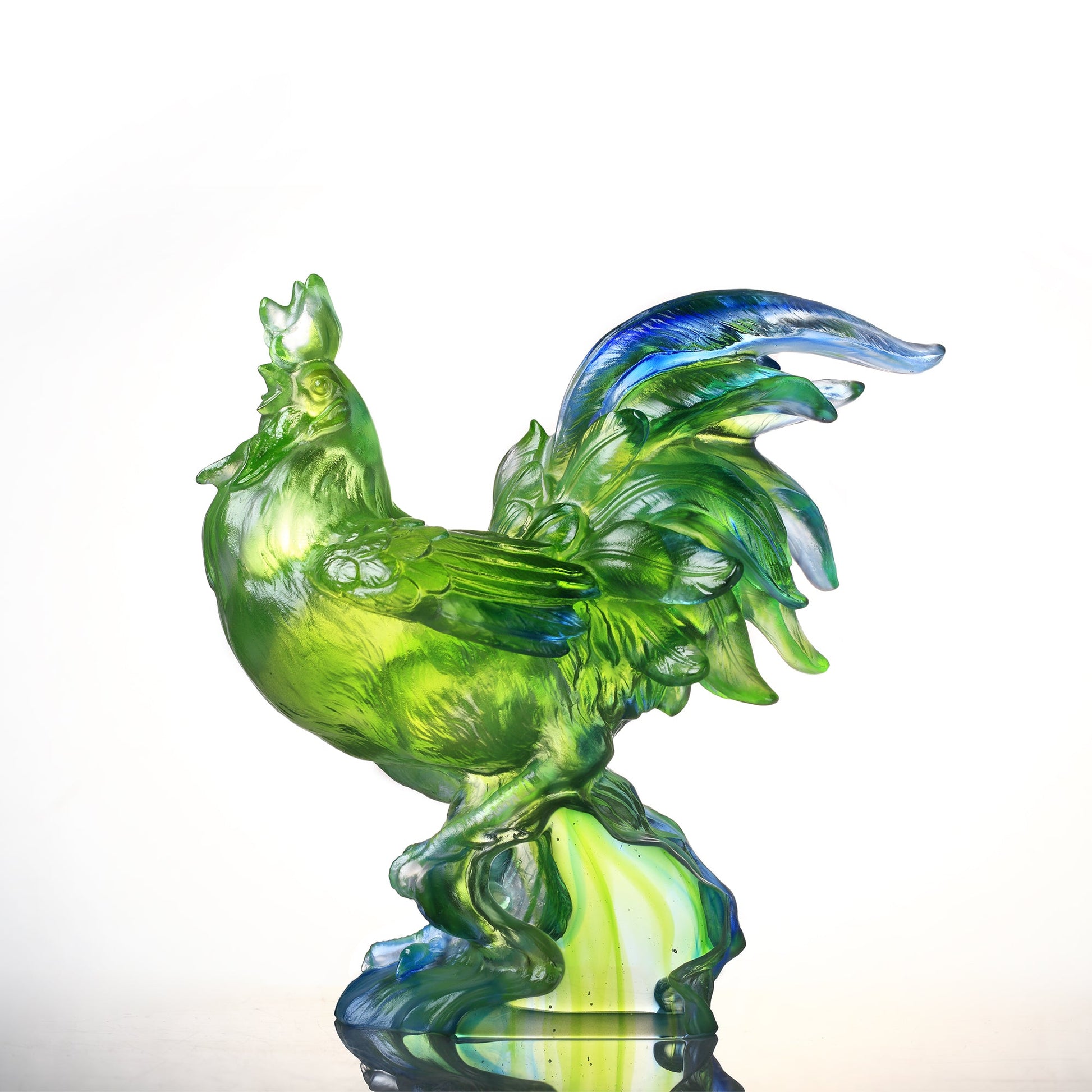 Design Concept: This is the exclusive design for MGM Resorts in the Year of the Rooster. The stately rooster stands in a powerful display of might and dominance. Its claws dig into the rocky surface to manifest the idiom shi shang da ji or, great fortune and profit. The rooster appears in lifelike representation through the sculptural precision of pâte de verre while the jewel-toned liuli highlights the magnificence of its crown and feathers. The polished base in contrast with the rest of the piece displays the material’s rich textural capacity. 展現雄雞昂揚的氣質,稱王奪冠的氣度。腳踏山石,附予“石上大吉”寓意 。以寫實的塑形手法, 兼具了琉璃的色彩和雕塑的形神,冠羽的華美,岩石拋光處理,表現了琉璃的豐富的內在質感。 |