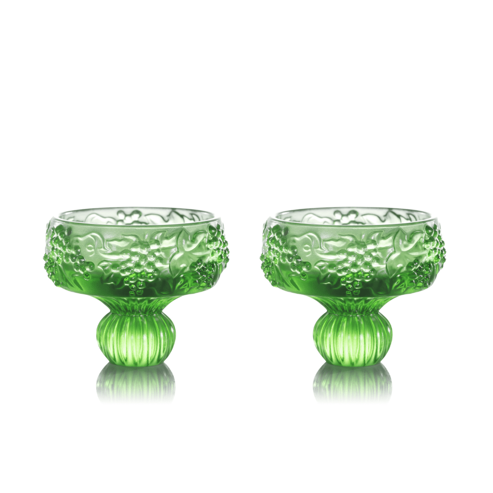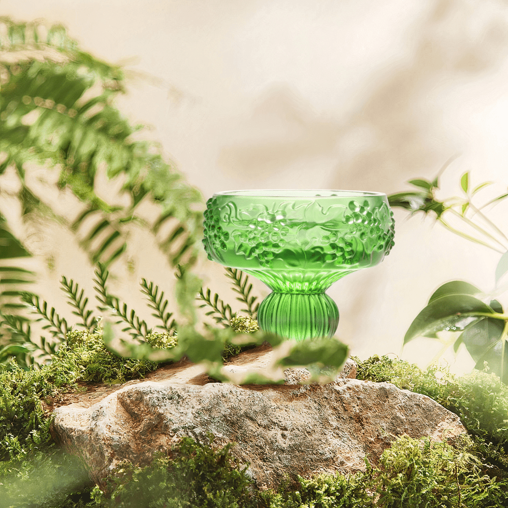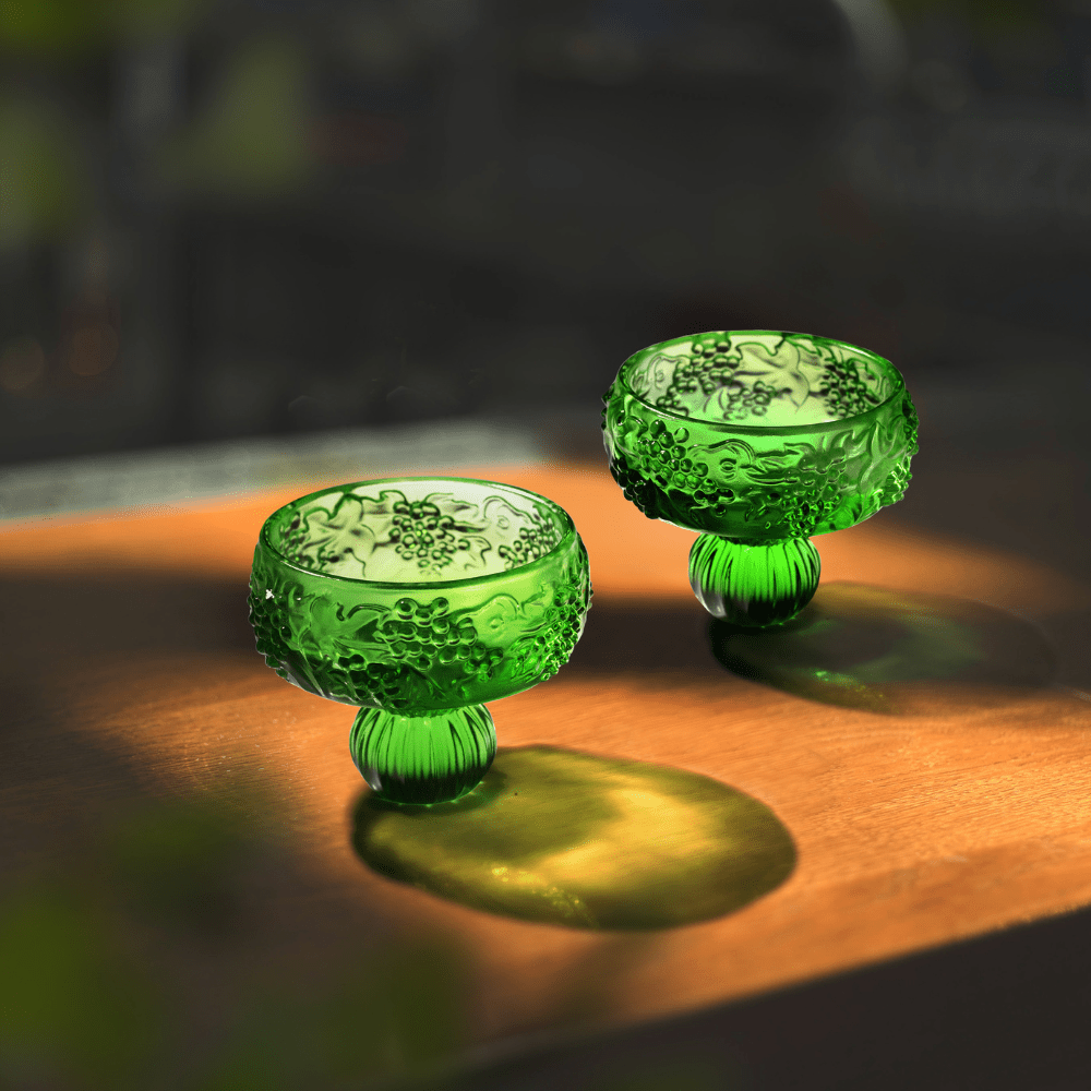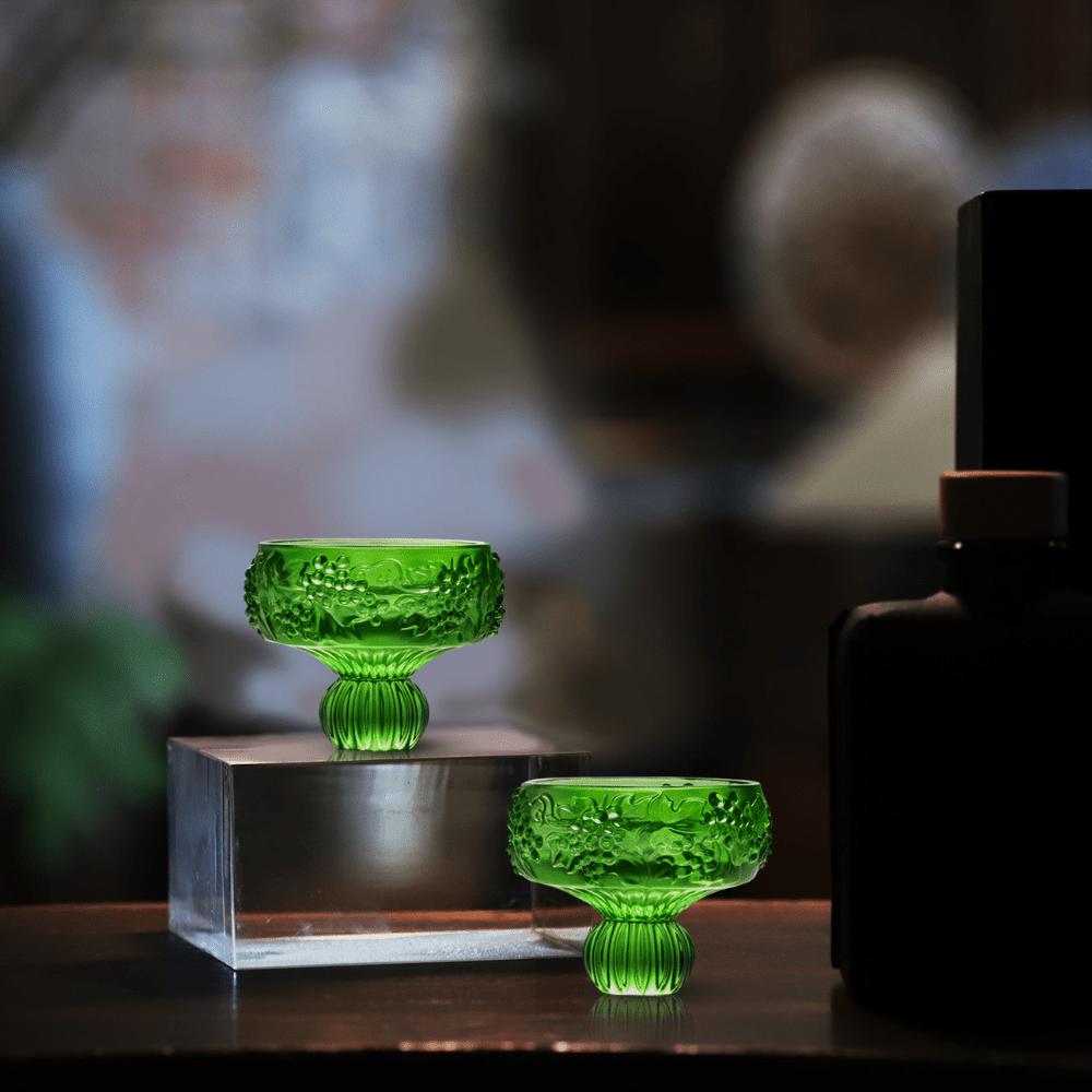 Design Concept: The grape design embodies abundance and the ceaseless cycle of life. Rich green LIULI forms encircling vines and full clusters of ripe grapes carved in high relief so that fingertips can trace the texture as the glass turns. The subtly inward curved rim concentrates the wine’s bouquet while the relief pattern reminds the drinker that blessings string together like thriving generations. The base of the glass features a pumpkin-shaped stem, symbolizing quiet strength and transformation. Its many facets catch and reflect light, adding visual warmth while evoking the slow ripening of a pumpkin—a metaphor for the beauty that comes with time and patience. Rooted in nature, this design grounds the glass with a sense of balance and seasonal abundance, aligning with the theme of savoring life’s moments mindfully.