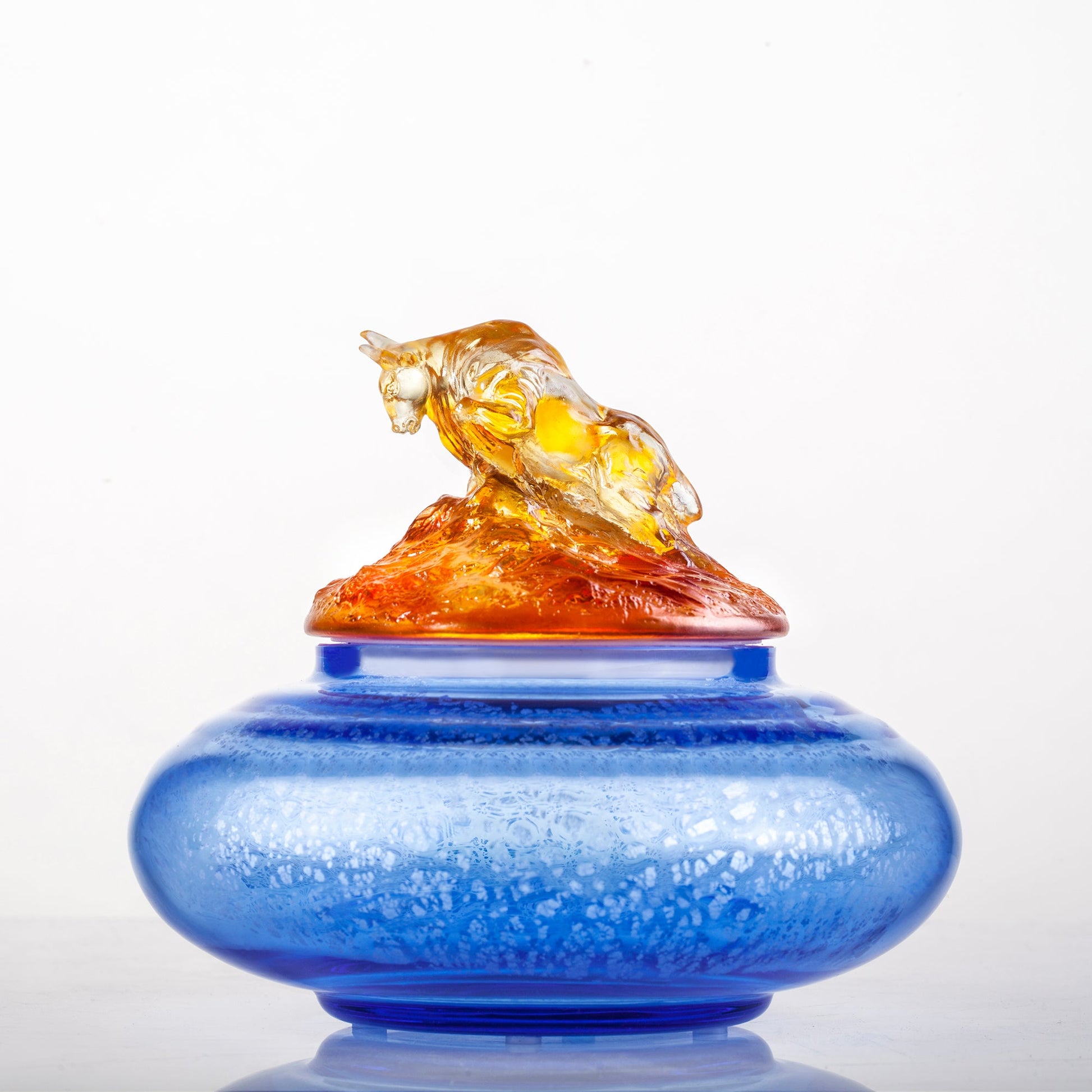 Design Concept: This is the exclusive design for South Coast Plaza in Year of the Ox. The ox is a trailblazer, a tenacious warrior joined by strength and beauty. Using the pate-de-verre technique, each detail in this dynamic ox sculpture was meticulously designed with an artistic eye. From its charging position represents relentlessly moving forward to its powerful hooves and stunning muscular frame, the sculpture encapsulates a spirit of triumph and hope. The proud ox stands upon a rugged terrain like a victorious hero. Under the ox is an elegant blown-glass receptacle with silver-foil highlights that shimmer like stars. The ox rises atop this constellation, like Taurus, a brave and true protector. The ox is never intimidated; it is a powerful protector. In strength and beauty, this sculpture encapsulates the essence of the ox. |